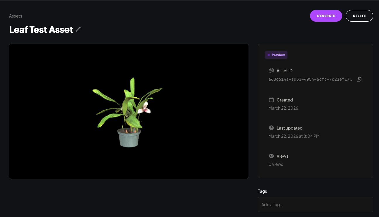 A Preview is a lower-fidelity version of your asset, typically ready in 5–10 minutes. It lets you check lighting, color, and overall appearance before spending a generation credit.